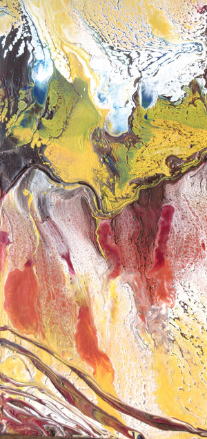 Abstract painting in orange, yellow, brown and white with a bit of cobalt blue.